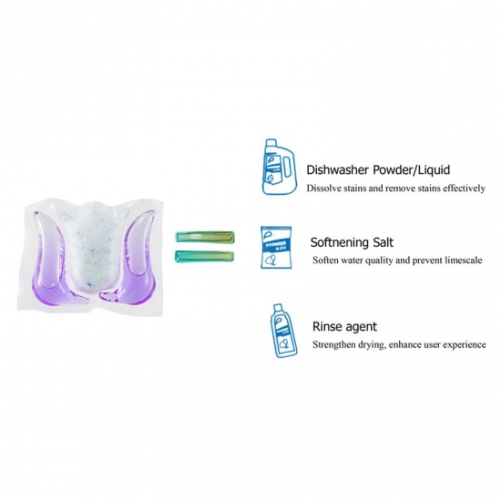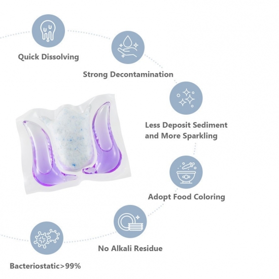 Les dosettes de lave-vaisselle sont capables de nettoyer efficacement notre vaisselle avec ultra propre. Avec des fonctions multiples d'élimination des taches tenaces, d'adoucissement de l'eau, de taux bactériostatique élevé, de prévention des redépositions et de création d'un effet étincelant supplémentaire pour la vaisselle, etc. Les capsules de lave-vaisselle ultra propres conviennent à la plupart des lave-vaisselle courants sur le marché.